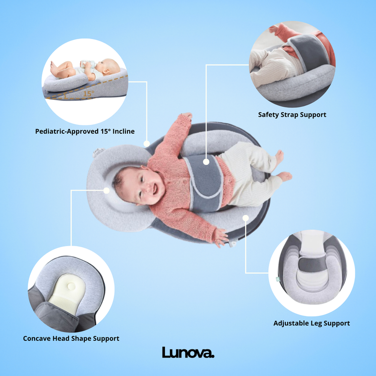 Lunova's Sleep Nest features a 15° pediatric-approved incline to gently ease acid reflux and encourage comfortable back sleeping. Its concave headrest distributes pressure evenly, preventing flat-head syndrome, while raised straps keep your baby safely centered. The ultra-soft memory foam core and breathable organic cotton cover ensure maximum support and airflow.