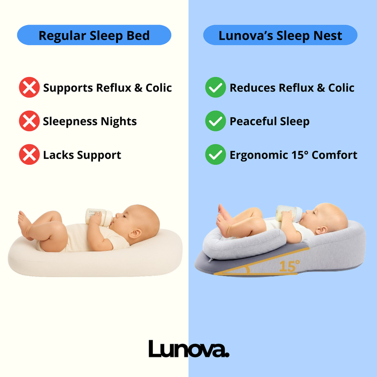 The gentle 15° incline and ergonomic design of the Lunova's Sleep Nest supports healthy digestion and reduces acid reflux, helping your little one sleep peacefully through the night. When your baby rests better, so do you.
